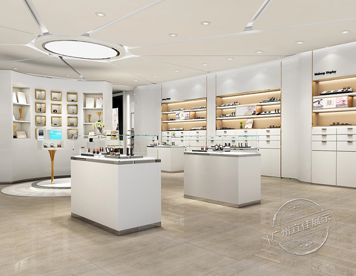 DERIK 化妝品玻璃展柜設(shè)計方案為商場店形式,柜臺均采用純木質(zhì)白色亮光烤漆,純白色LED燈,及透明鋼化玻璃相結(jié)合,彰顯化妝品的檔次,化妝品中島制作[宜佳展示]采用木質(zhì)烤漆和不銹鋼制作,全面提升視覺效果,凸顯品位高端質(zhì)感。