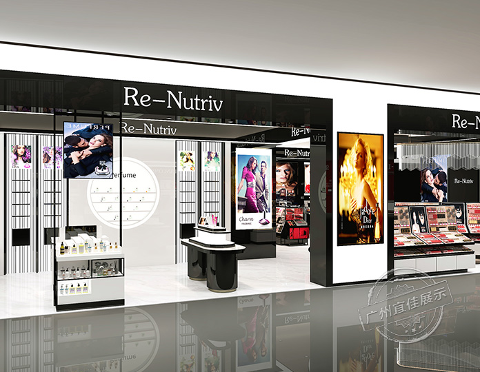[宜佳展示]40000㎡實(shí)力廠家,在此店的化妝品展柜上,采用簡單的黑白配色+YJPY漆面工藝,如鋼琴版絲滑,配上通透的大理石地板,讓人視感得以放松,同時(shí)顯示出高端質(zhì)感。