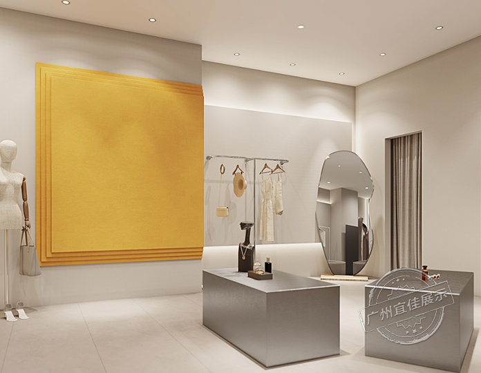 此店的奶油風(fēng)格,服裝展柜設(shè)計(jì)采用淺色調(diào)和柔和的曲線,營造出輕盈、優(yōu)雅的氛圍,給人以溫馨、舒適的感覺。考慮了實(shí)用性和裝飾性相結(jié)合,其中加入了橙色背景墻和亞克力板,提升了柜子的美感,集優(yōu)雅舒適與時尚品味于一身。