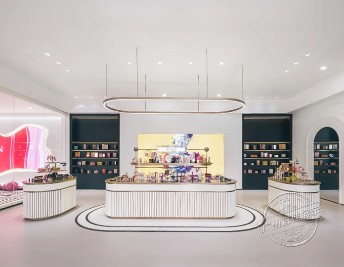 歐思蘭化妝品展廳展柜整體采用高貴的金色、端莊的白色、嫵媚的粉色,以及時(shí)尚界經(jīng)典的黑色,無不逐一的散發(fā)著女性的魅力??梢钥吹叫缕氛故緟^(qū)與以往商品陳列區(qū)的裝置,兩者以高端商品展示區(qū)的裝置為中軸線,對稱且造型一致鋪設(shè)開來。淺金色不銹鋼材質(zhì)的展柜與亞克力材料的對比,虛與實(shí)的結(jié)合,模糊兩者之間的界限。相同的是兩個(gè)區(qū)域的化妝品展廳展柜,采用重心向下的方式,與高端商品展示區(qū)呈重力向上的裝置區(qū)分開來,并且兩個(gè)區(qū)域使用圓形吊燈的方式以此達(dá)到三者視覺上的高度統(tǒng)一。
